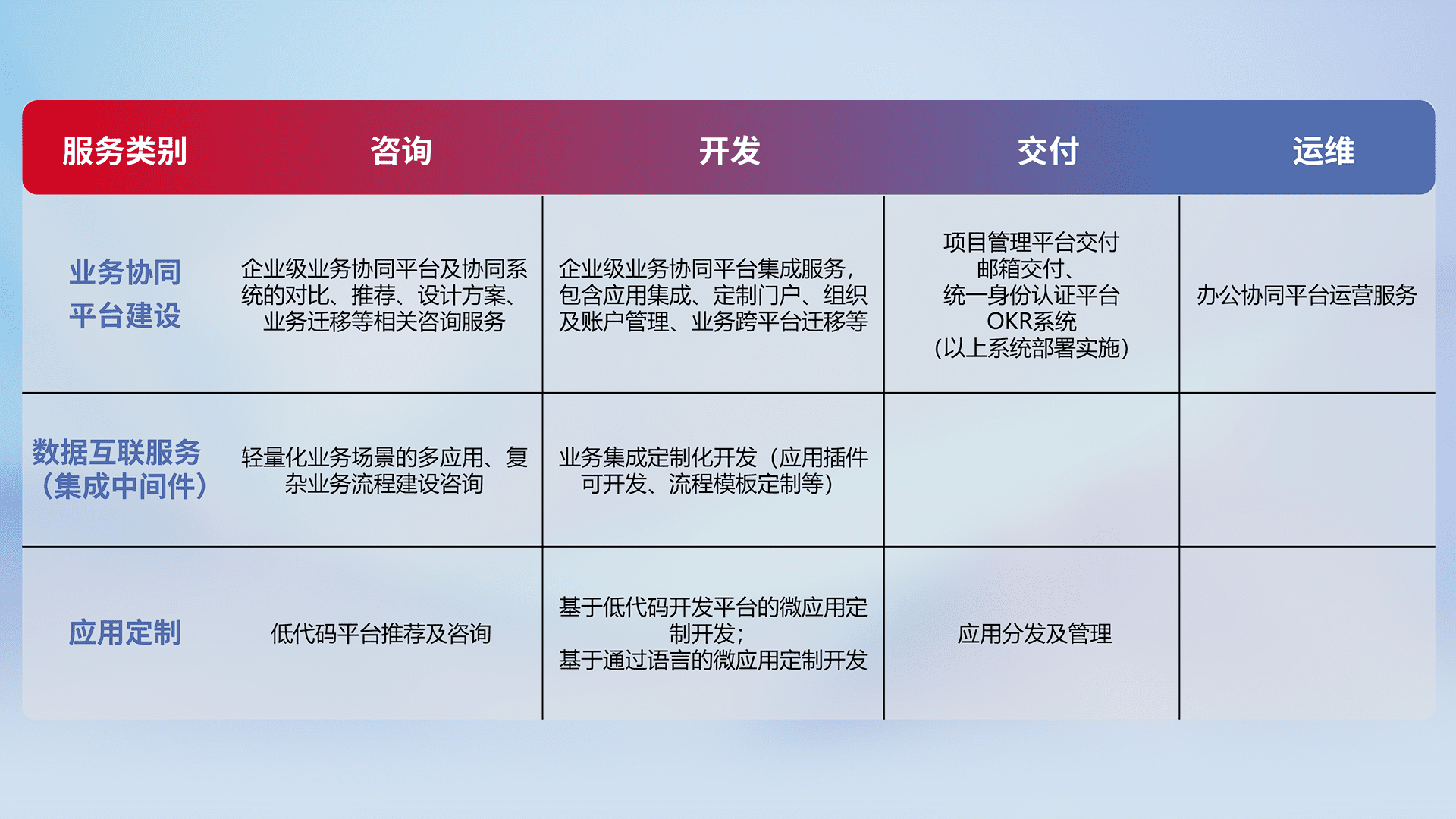 针对钉钉、、、、企微、、、IDaas等平台级产品提供产品的规划、、、、方案、、、、交付、、定制化开发等服务,,实现如统一协同办公、、、、智能客户服务、、、混合会议管理、、智能数据查询、、、等业务场景,,实现数字化转型。。。。