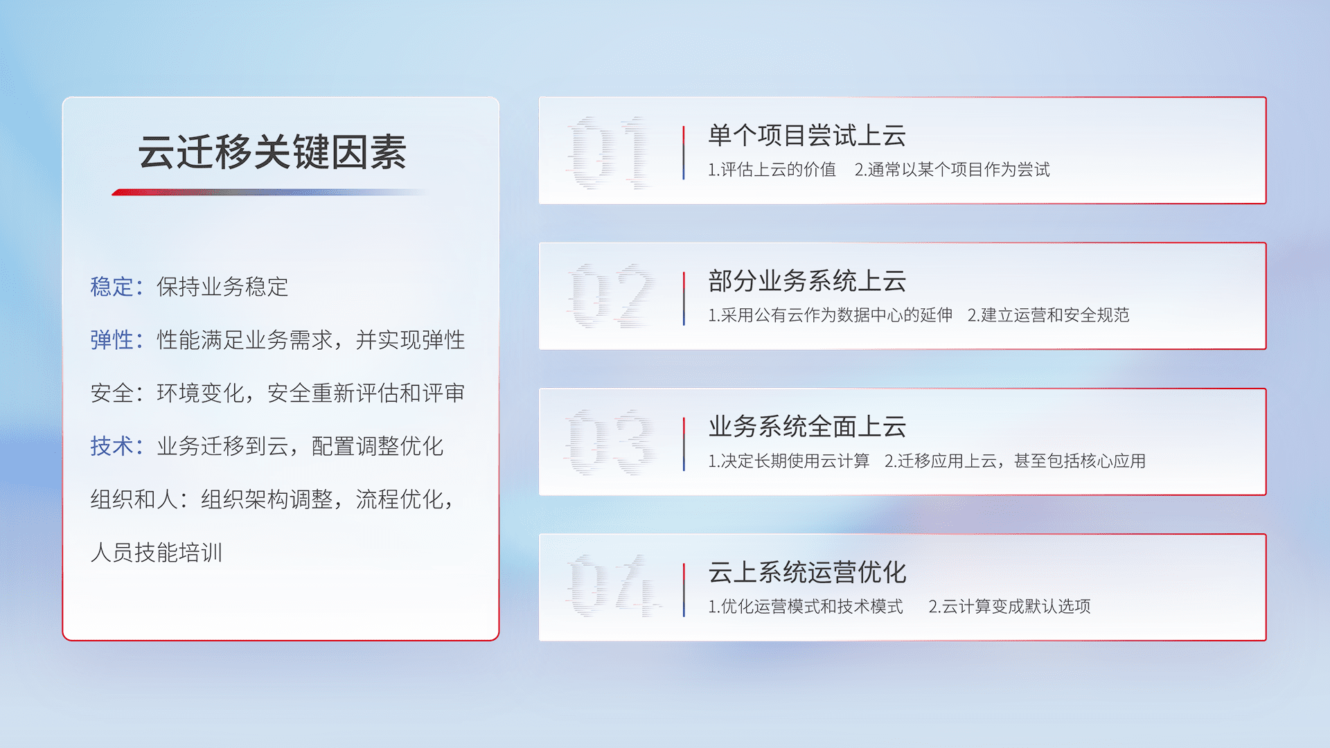 结合实际业务,,从规划设计、、云平台选型、、云原生改造、、数据迁移、、集成交付,,,迁移全过程为客户识别最佳上云路径,,做好风险识别管理,,设计网络架构、、、、身份权限、、安全审计合规、、、操作审计、、、日志审计、、监控告警策略、、、、多站点容灾设计等,,,,对云上基础设施进行整体规划,,提升IT治理水平,,,以满足弹性、、、高可用、、高性能的需求。。
