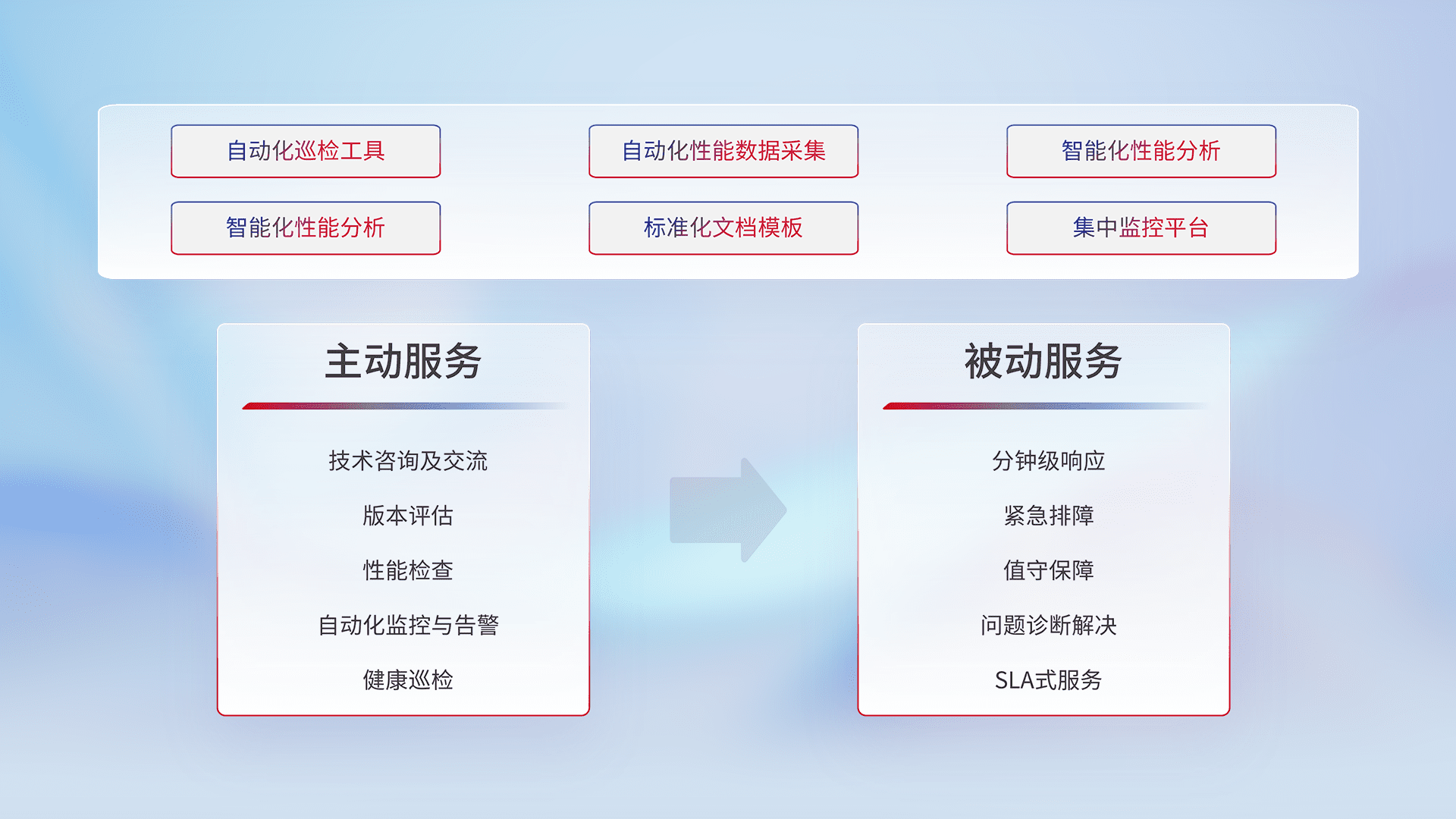 智能化工具和标准化文档,,,,保障服务质量,,,提供主动服务(包含技术咨询、、、版本评估、、性能检查、、、、自动化监控与告警、、健康巡检)和被动服务包含(分钟级响应、、、紧急排障、、、、值守保障、、问题诊断解决、、、、SLA服务)。。